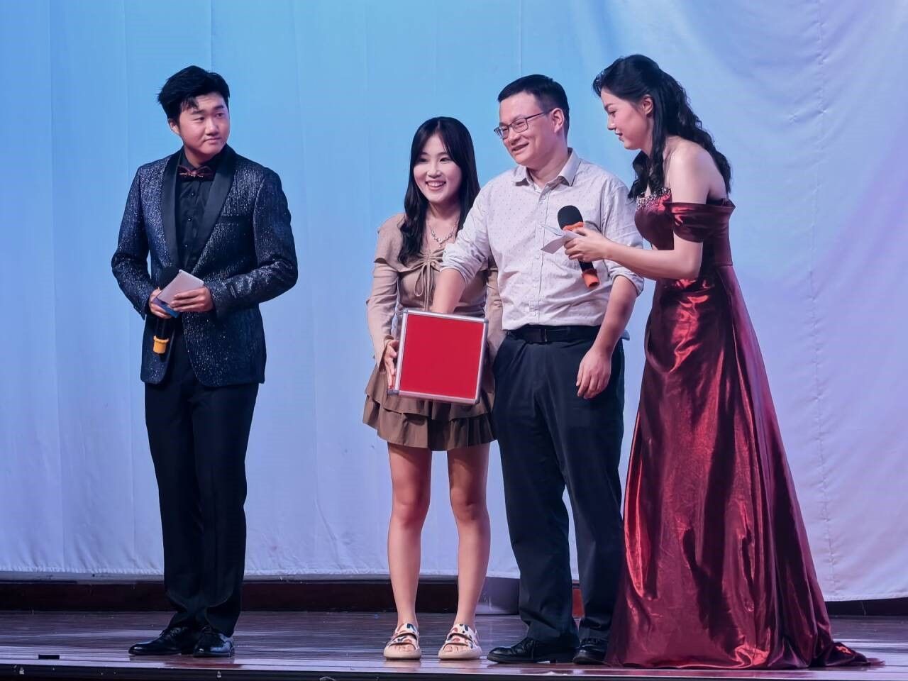 在热烈的掌声中,马艺萱、张佳乐、于千朔、郑天宇四位主持人一齐登场,正式宣布晚会的开始。
