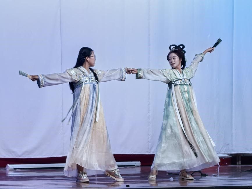 悠扬的古风乐曲响起,杜欣颖、李梦寒同学为大家带来舞蹈《寄明月》。折扇在演员们手中纷飞起舞,一颦一笑、眼波流转间尽显风采,如诗如画,美不胜收。