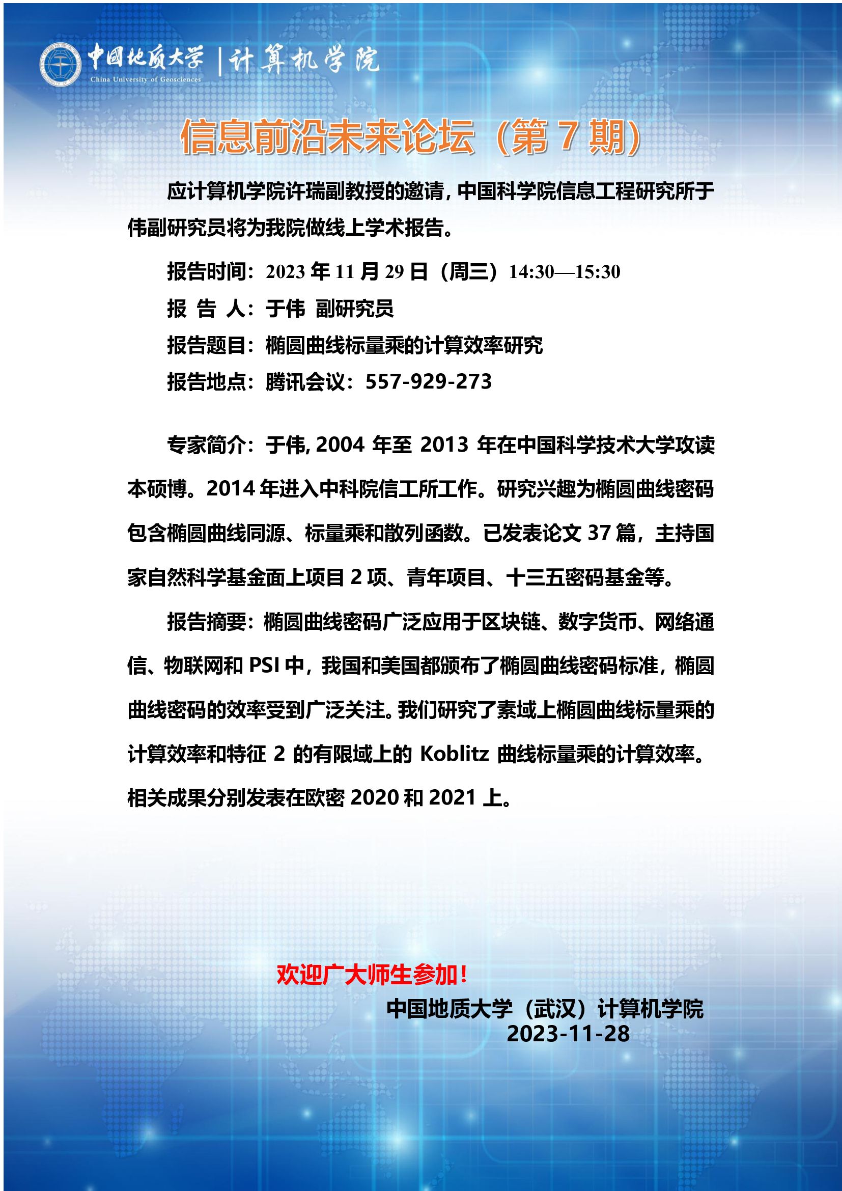 信息前沿未来论坛(第7期):中国科偷拍外流 信息工程研究所于伟副教授——椭圆曲线标量乘的计算效率研究